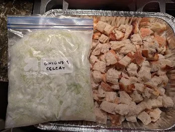 PREP FOR HOMEMADE STUFFING - Grandma Wasko’s stuffing relied heavily on onions, celery, butter & fresh parsley for flavor. A few weeks before Thanksgiving, I mince one large onion (a large-hole grater works well) & 4 ribs of celery, then sauté them in a stick of butter (the real stuff, not the fake stuff). Then I freeze it in a quart freezer bag until the day I want to mix up the stuffing.